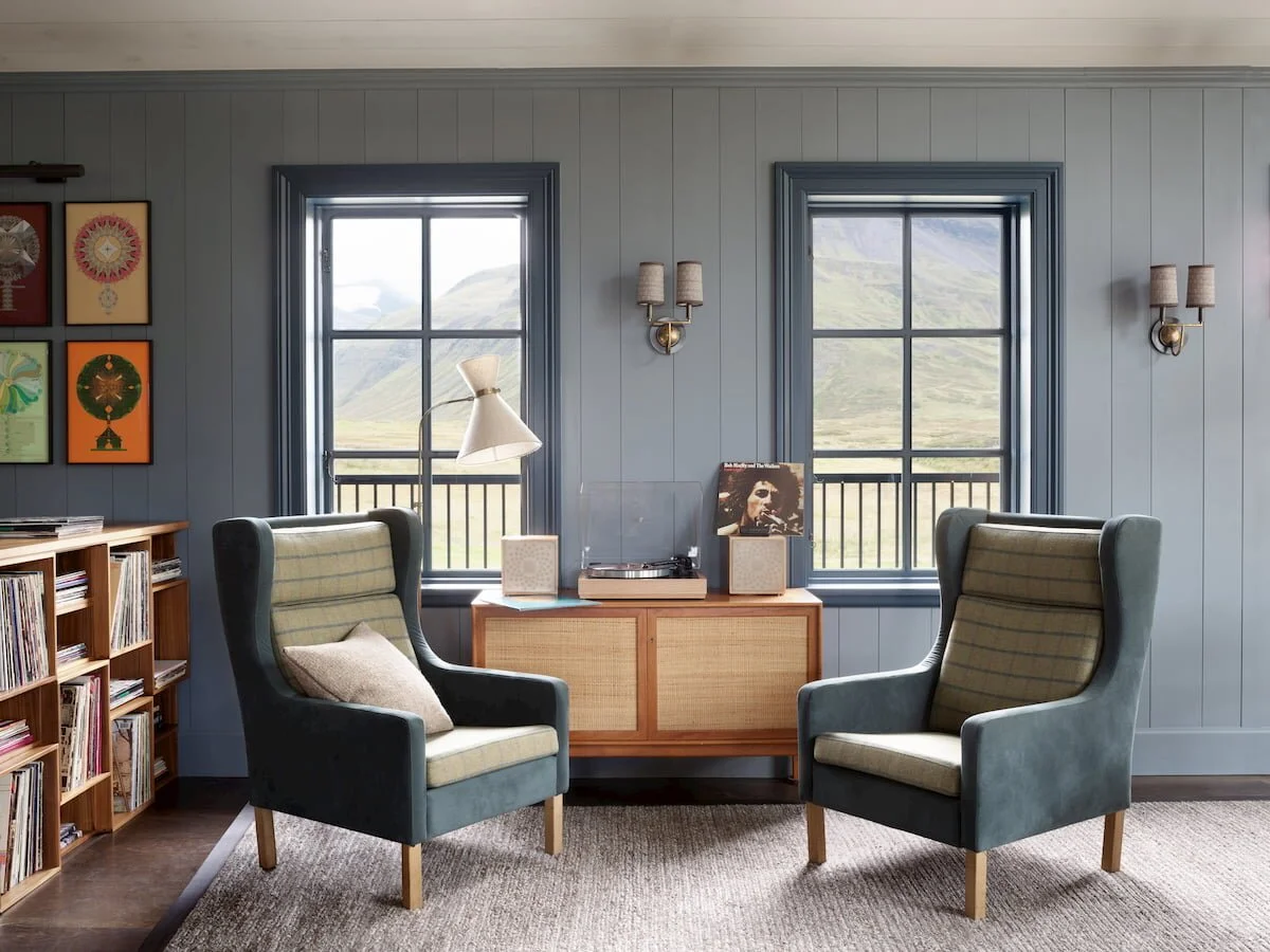 Inside, we layered rich colors with bold patterns to bring warmth and energy to the space. Mid-century iconic designs by Wagner, Dietzel and Moeller introduce clean, elegant lines that complement the stark exterior landscape. A curated collection of Icelandic art grounds the lodge in the culture and beauty that inspired it. At Deplar Farm, every detail was designed to make you feel invigorated by the wild, rugged beauty and embraced by the comfort within.